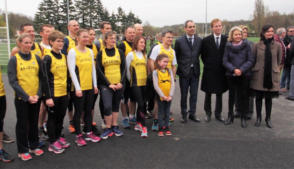 En début d’après-midi, changement de décor:  accueillie par Rémi Martial, le maire de Léves, nous avons procédé à l’inauguration de la pelouse synthétique nouvellement installée sur le stade Claude Piau en l’honneur duquel avons dévoilé une plaque commémorative en présence de son épouse et de sa famille.